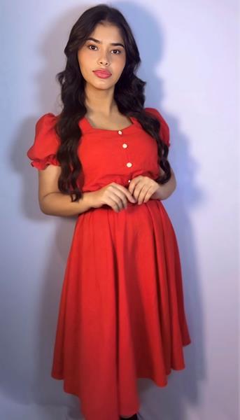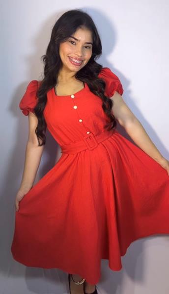 vestido em crepe de seda , com cinto com detalhes em botões pérola.